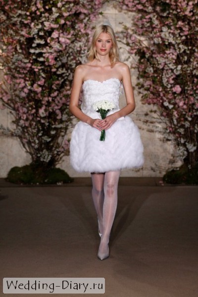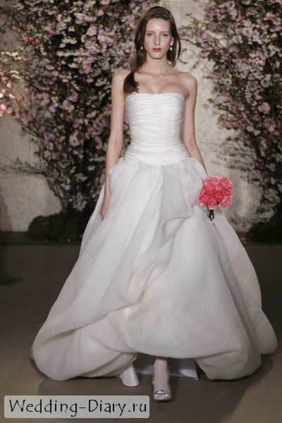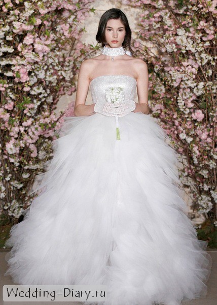 В весенней коллекции Oscar de la Renta присутствуют как классические платья А-силуэта, выполненные из шикарной ткани, так и пышные многослойные модели. Высокие девушки наверняка выберут шикарное платье силуэта русалка, украшенное вышивкой ручной работы, драпировками и роскошным болеро. Обладательницы идеальных ножек предпочтут укороченный вариант свадебного платья. Любая девушка выберет из этой коллекции свадебное платье себе по душе!